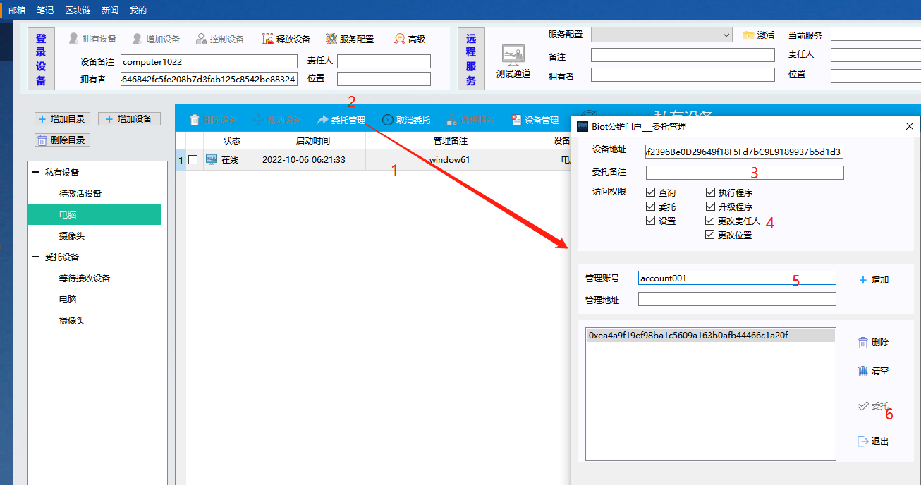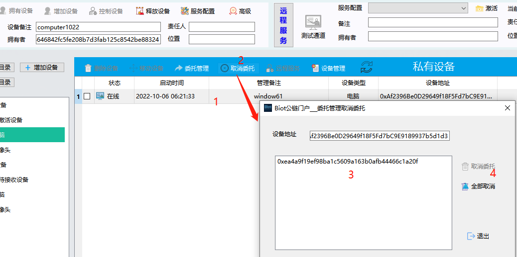 注:取消委托时候,会自动取消下面所有被委托地址,包括下层迭代委托操作,一旦取消,下面被委托的人就再也无法看到该设备信息,这样方便设备管理权限的收回。
