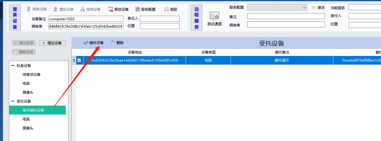 一旦委托给对方后,会自动加到等待接收设备目录,只要对方自主接收,才能对该设备进行管理