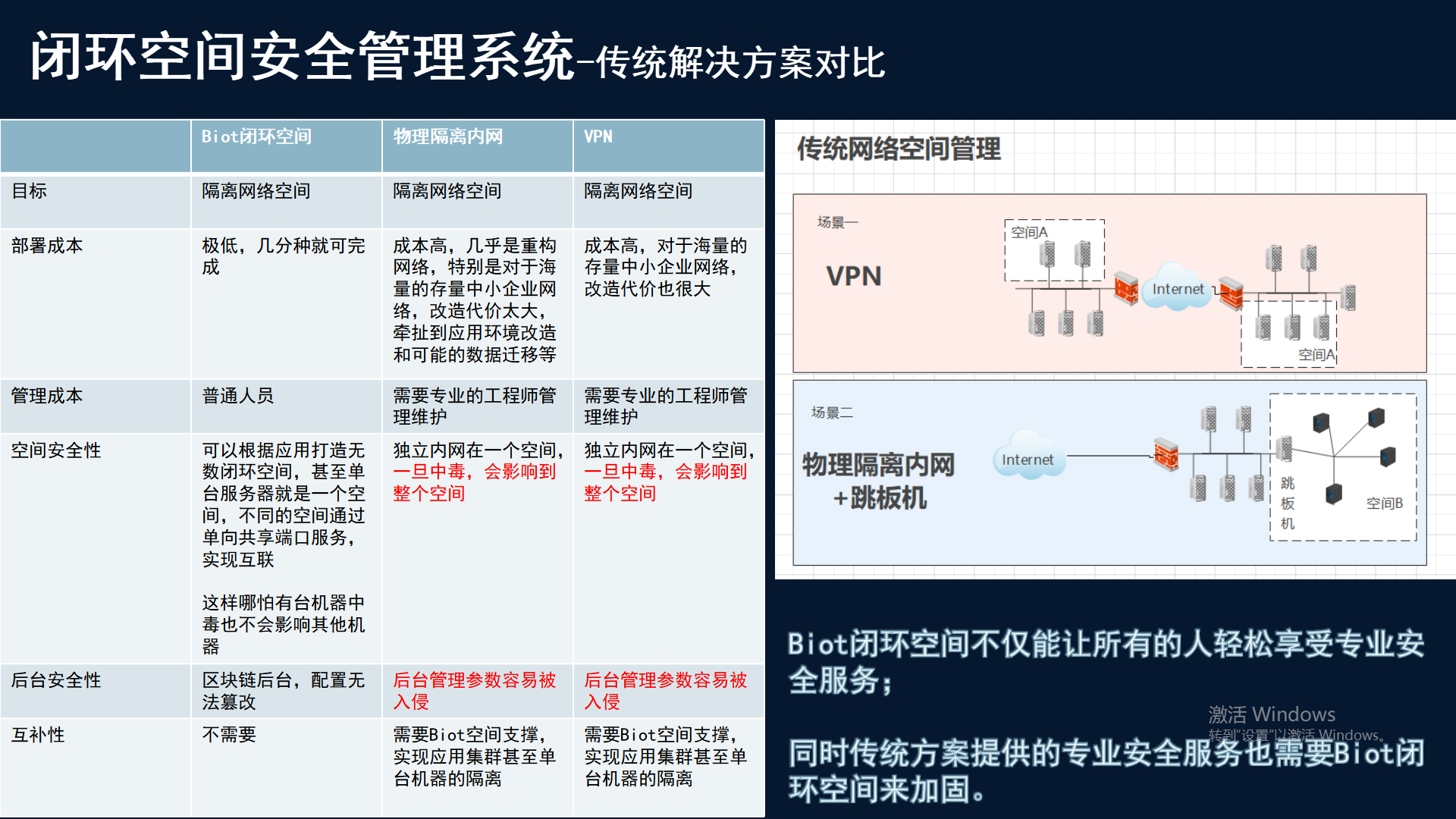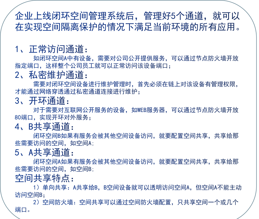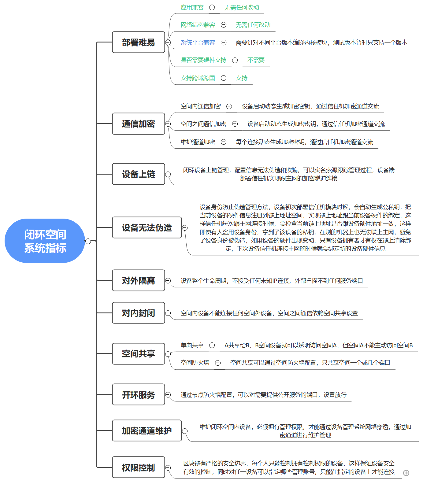 闭环空间是Biot物信链最主要的应用输出,闭环空间可以针对一台机器,也可以是一个应用集群,也可以是跨域跨国的设备,效果等价于物理隔离的内网环境,同时空间内和空间共享互联通信采用量子级别安全加密通信,由于Biot物信链实现的是一种基于源码安全的网络隔离,链上隔离和终端隔离控制可以象网线一样,值得信任,因此Biot物信链闭环空间的推出,是一个网络时代从蛮荒原始时代进入有家居住的文明时代的跨越,在所有信息环境都进入空间隔离(不依赖任何第三方,安全建造不同房屋)时候,Biot物信链划时代的贡献才会体现出来。