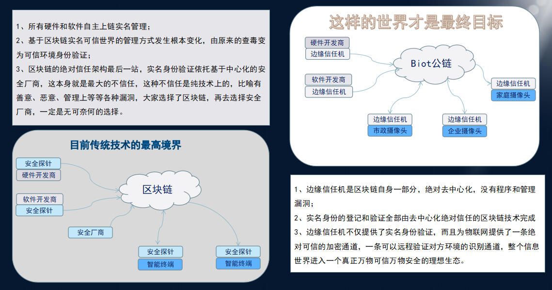 目前摄像头,不管是家用还是工厂、市政,都有各种漏洞,几乎90%以上被各种外力掌控,摄像头设备上链管理是必然趋势,依托去中心化信任机(网络机器人)的