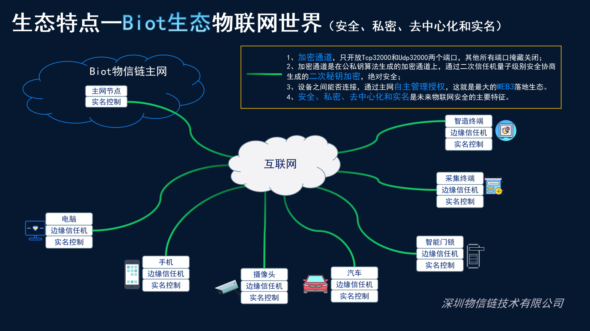 管理,真正实现万物互联,万物安全,依托区块链加密架构,任何人不可能去控制其他人的设备,通过摄像头的绝对安全控制,率先